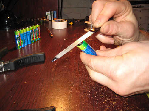 Preparando las baterías. He usado muchos diferentes tipos de baterías. Esta vez estoy usando veneno 2400 mah baterías. Yo empezar por carga. Les tomo mi Lima de uñas barato y rayar las tapas y fondos. Para que la soldadura tiene que agarrar en.