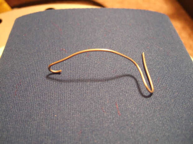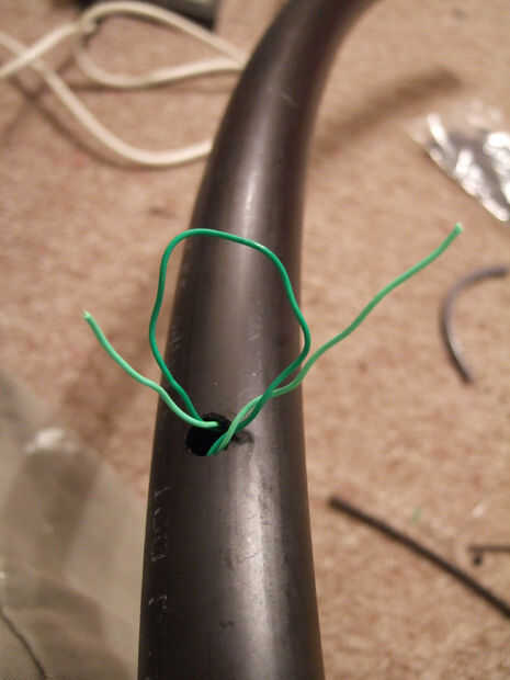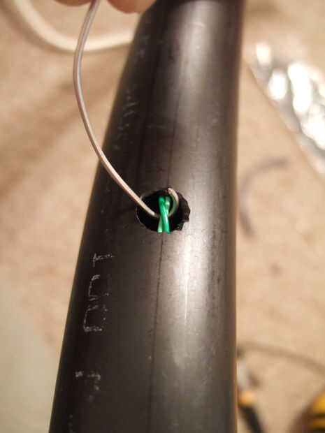 Con el cable tira de la herramienta, pescado alrededor del tubo y tire de los cables a través del primer 1/4 agujero. Ya que es el extremo del hilo, tirar de él completamente hacia fuera... una resistencia de LED pueden soldarse directamente al final (siguiente paso). El resto de los cables debe extraer sólo unas pocas pulgadas, lo suficiente para trabajar con.