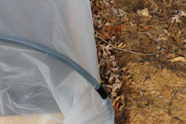 Corte 2" piezas de riego de la manguera y luego corte una raja completamente a un lado de ellos. Estos se enganche sobre el marco plástico y la manguera para asegurar el plástico en su lugar. Yo sólo recorta les a un lado de la manguera para que fácilmente puedo doblar la espalda plástico en clima más cálido.