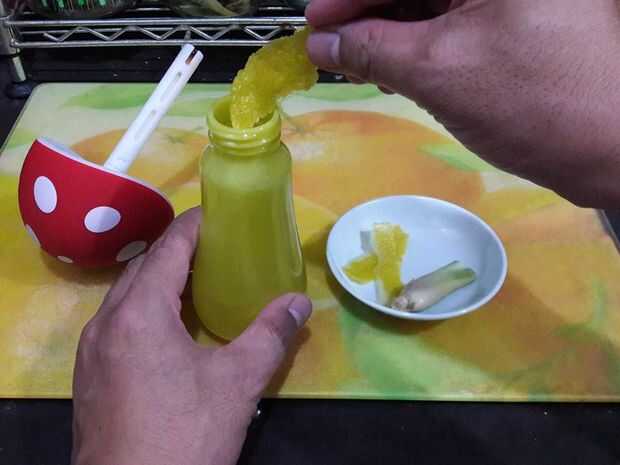 Luego, vierte el agua tibia en el reservorio del humidificador. A continuación, he insertado las cáscaras de limón y la hierba de limón triturada. El aroma de limón y la hierba se difunden en el agua.