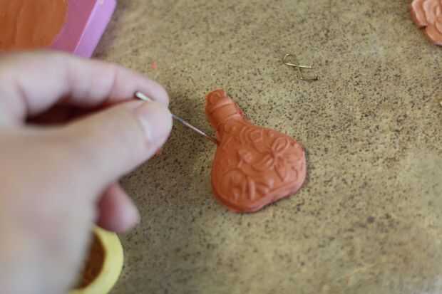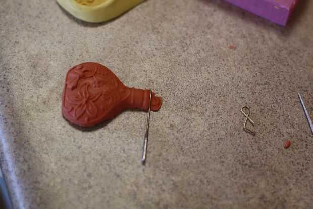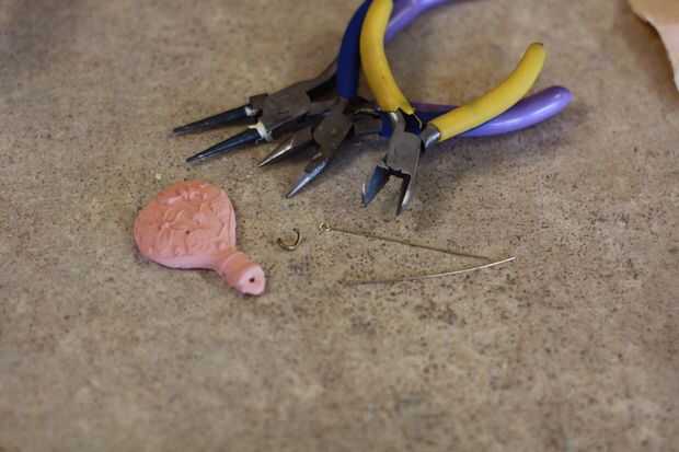 Vamos a hacer otra forma quería un Jarrón y se usar la aguja para cortar la parte superior para hacer un bucle de alambre para colgar el colgante. Corte alrededor de la vasija, de presionar la aguja hacia abajo para cortar la parte sobrante, tomar uno de los pasadores y plegado con los alicates de joyería para hacer una forma que integrar bien en el barro y 'agarrar' la arcilla antes de que se puede extraer fácilmente. Poner en la vela más cálida para secar, añadir arcilla un poco sobre el perno incrustado y use pincel y agua para adherir la arcilla juntos. Cuando usted dobla el pin para hacer el ciclo que será para la cinta, asegúrese de quede como quieres la cinta a través del hilo de rosca (mi primer intento anterior, me olvidaba! Usted debe hacerlo hacia los lados para la cinta de hilo a través de bien).