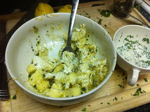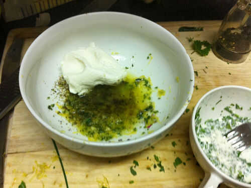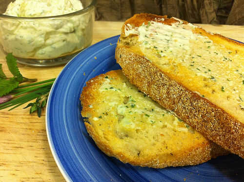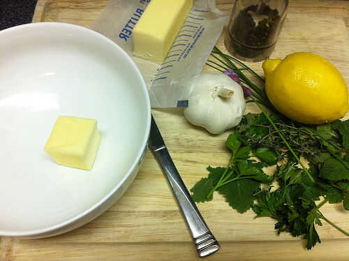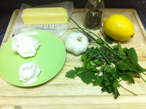 2 T de mantequilla en un tazón de fuente del derretimiento. Coloque el resto de la mantequilla y el queso crema en el contador se ablande a temperatura ambiente. Finamente picada el ajo fresco y añadirlo a la mantequilla derretida. Picar finamente las hojas de salvia (es un poco gruesa y difusa, no divertidos a masticar hacia abajo en) y añadir a la mantequilla derretida. Cortar las flores de cebollino si los tienen y agregar a la mantequilla derretida, junto con las hojas de tomillo (un poco de dolor para quitar de los tallos). Lavar el limón, jugo con un microplane y añadir la cáscara rallada a la mantequilla derretida.