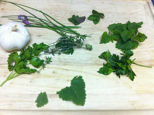 Hierbas frescas de 1/3 C - 2 Menta hojas, unas ramitas de perejil italiano, unas ramitas de tomillo, varias hojas de cebollino (incluyendo las flores si quieres), unas ramitas de bálsamo de limón y la mitad una hoja de salvia