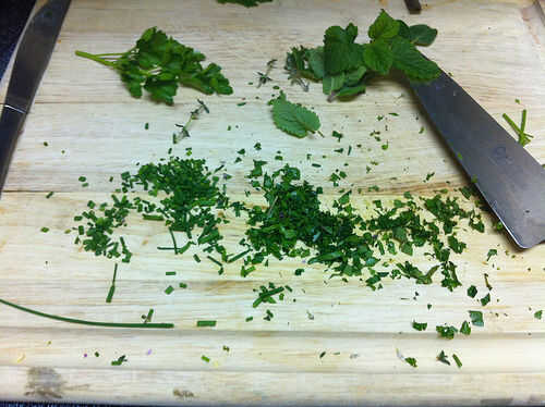 Picar el cebollino (menos las flores que usted ya ha agregado a la mantequilla derretida), bálsamo de limón, menta y perejil. Añadir a la mezcla de crema agria.