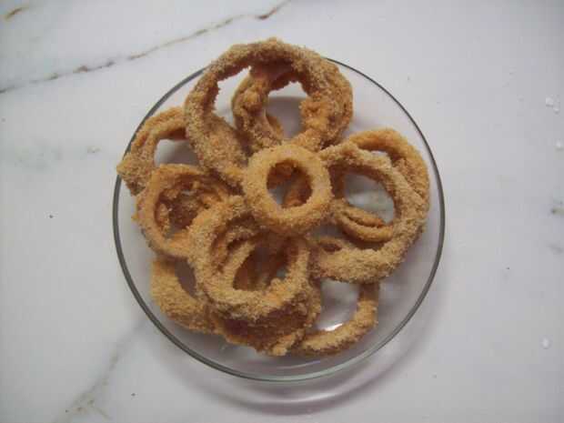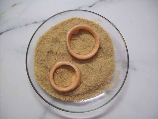 1. transferir los anillos de cebolla a la taza de miga de pan. Dragar o tirar el anillo de cebolla en el pan rallado hasta cubrir.