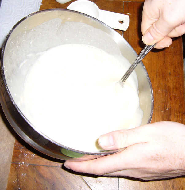 Bate el huevo y la leche en la mezcla de harina con un tenedor.