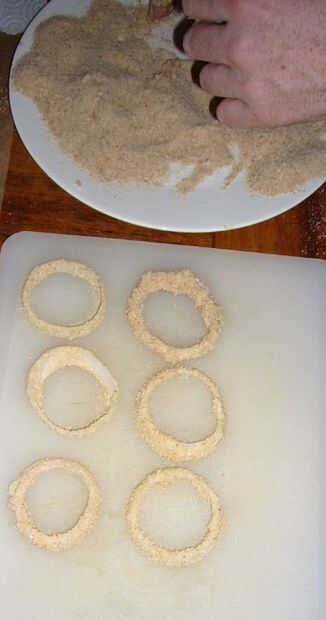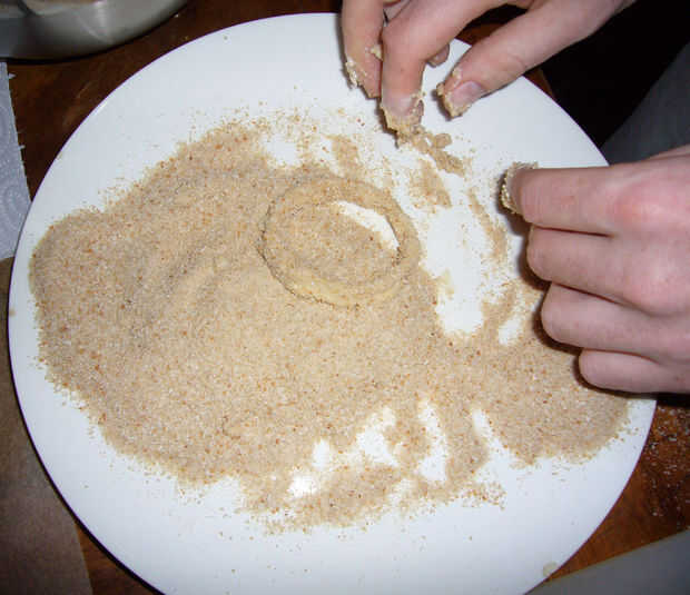 Difundir las migas de pan en una placa o plato poco profundo. Colocar anillos de uno en un momento en las migas y cucharada las migas hacia arriba sobre el anillo de la capa. Le dan un toque duro como se saca de las migas. La capa debe agarrarse muy bien - si no es así entonces los anillos gotearon demasiado seco. Repita con los anillos restantes.