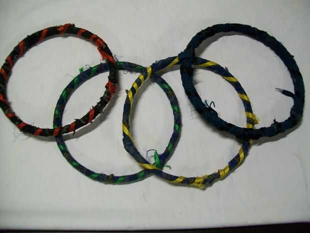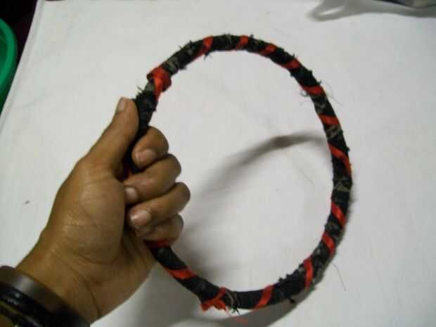 He usado aros de bordado de bambú (1 aro = 2 anillos, usé dos aros para hacer cuatro anillos...) y envuelto con tiras largas de material de desecho. Entonces utilicé hilo de nylon para atar el material en no soltarse y por último, para añadir un poco de color envuelve la cinta alrededor de los anillos.