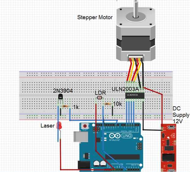 En primer lugar, coloque el ULN2003a, el transistor y las resistencias en la placa. Conecte el motor y los puertos de Arduino como se indica en la imagen de fritzing.