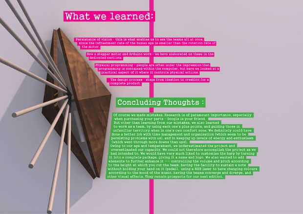 hacer un mejor trabajo con gestión del tiempo y organización (que parecen ser problemas persistentes con nosotros) y en mantener los niveles de energía y entusiasmo (que fue a través de más bajadas que la ups). Debido a nuestra edad y temperamento, subestimó el proyecto y sobrestimar nuestra capacidad. Podríamos no por lo tanto lograr el proyecto como nosotros hubiéramos pensado a. Nos hubiera gustado mucho personalizar el arpa girando