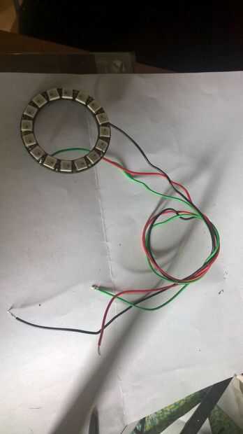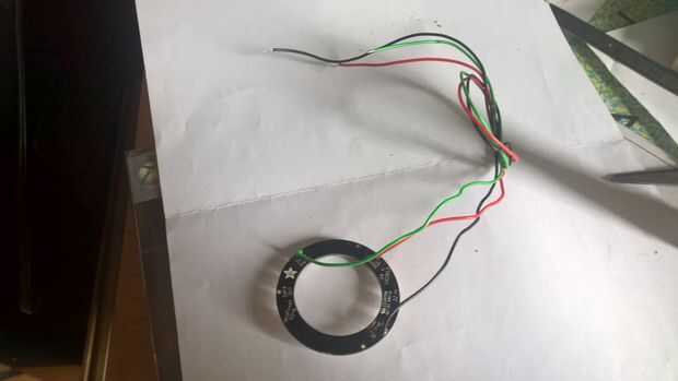 En el anillo de neopixel, soldar un cable rojo a los + 5V, uno negro, y verde (por ejemplo, yo quería blanco al principio... pero suceden cosas) a los entrada de datos.