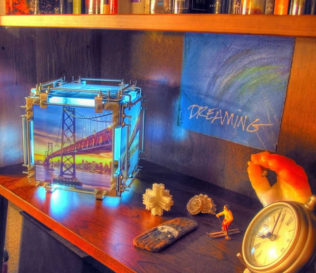 ... con iluminación interna. Para la iluminación utilicé tres pilas "menores" led luces del gabinete. Las luces se colocan cuidadosamente para evitar puntos calientes de iluminación; es bastante baja para permitir que la luz se extienda y suavizar apuntando hacia arriba. Las dos luces restantes se dirigen horizontalmente en la parte posterior del cubo; Esto permite que la luz rebote del blanco en los grabados de frente hacia atrás, dando por resultado un resplandor suave y uniforme en las impresiones mirando hacia adelante.