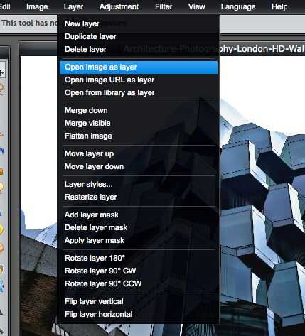 Usted puede agregar más imágenes de collage haciendo clic en el capa, Abre la imagen como capa, y seleccionar la imagen que desee agregar.