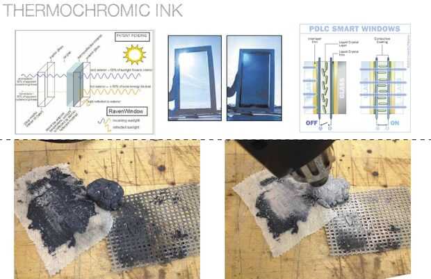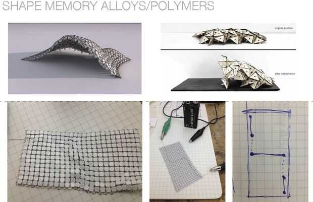 Estos son los métodos y materiales que analizamos en clase que eran más intrigantes para mí. Aleaciones con memoria de forma permiten la posibilidad de una estructura desplegable sombreado que autoactualiza cuando se calienta. Tinta de pigmento podría añadirse a una película en el vidrio para crear sistemas de acristalamiento que se auto sombreado (transición piensa en gafas de sol!)