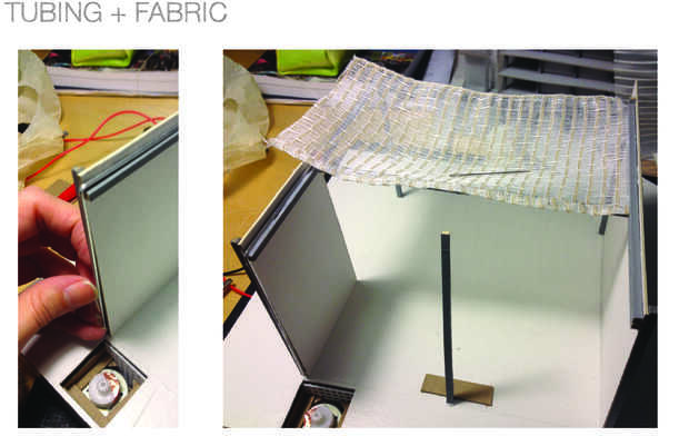 Tiempo a añadir a la tela! Este es el principal movimiento en el proyecto. Primero até el sedal en el engranaje en el motor, dejando un montón de holgura. Solía doblar tubo de metal hueco en un ángulo de 90 grados la línea a través de pescado y había cosido a la tela. No te preocupes la pulcritud de sus puntadas, la línea de pesca es invisible, pero el tamaño y la colocación de ellos afectará el movimiento una vez que usted arranca el motor.