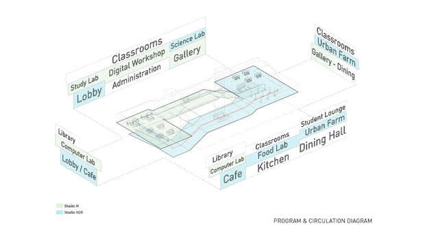 El enfoque del proyecto estudio H20 es conservación del agua, como un controlador de diseño de la propuesta de construcción y también como un componente curricular para programa de diseño y construcción del Reino Charter School "Studio H". La geometría del edificio responde a las redes urbanas paralelo y diagonal de Berkeley, y el programa se organiza según dos aspectos del plan de estudios de la escuela: estudio H, programa de diseño y construcción de la escuela y Studio H2O, un nuevo programa que se centra en la agricultura hidropónica como una herramienta educativa. El proyecto incluye un sistema de cultivo Aeroponico, que permite un uso más eficiente del agua (con menos de 1/8 de la consumición del agua de cultivo de tierras). La propuesta también incluye un sistema de agua gris que integrará la colección de agua alrededor de los tejados, y el edificio cosechar suficiente agua durante todo el año para resistir varios meses sin lluvia.