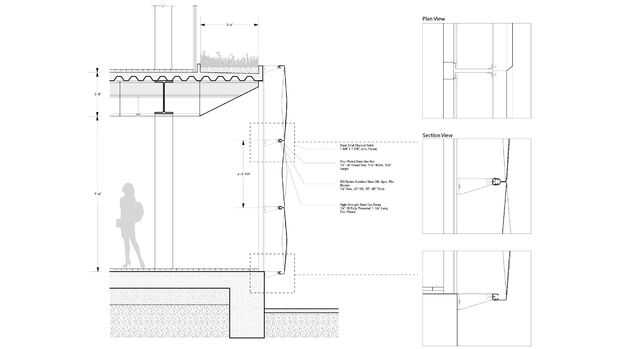 Los paneles son fabricados con acero inoxidable de calibre 18 y doblados para incorporar bridas para fijación en los bordes superior e inferior. El sistema de fachada también funciona como una barandilla de techo en la parte superior del edificio.