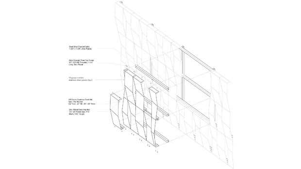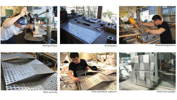 Los prototipos se reunieron en la tienda de CCA. Las curvas de los paneles se hicieron con una rotura de la prensa. Muescas de cortes pequeños fueron cortadas con el chorro de agua al índice de la ubicación precisa de cada pausa, para que los estudiantes sabían exactamente dónde a la rotura. Unistrut de acero estándar estructura fue utilizada para estructura de copia de seguridad.