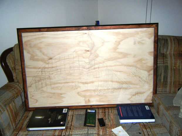Establecer el panel de madera casi vertical y utilizar el proyector para poner la imagen de pantalla completa directamente en el campo. Con un ligero toque con un lápiz, trazar las grandes líneas, contornos y detalles en la madera. No dibujes demasiado pesado ya que las líneas tendrán que borrar más adelante y no te preocupes que cada matiz; Es bastante fácil de llenar.