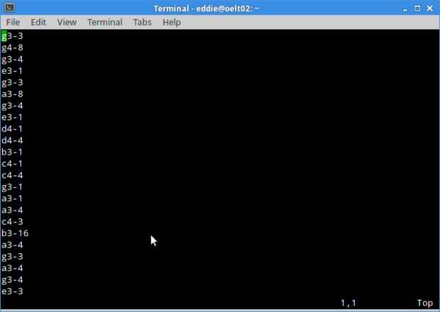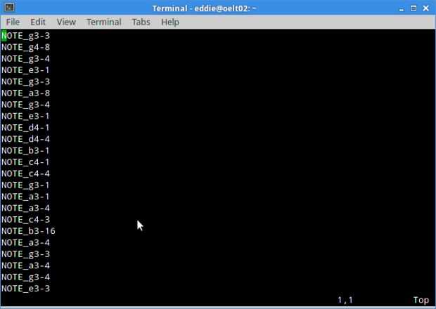 Así que empezamos a hacer nuestra propia traducción usando vim para registrar los resultados. Ya que es 3/4 tiempo, las cosas serán difíciles. Uy cada cosa es en minúsculas y tenemos que añadir el NOTE_ al principio de las notas. No hay problema. un g ~ ~ convertirá las letras en mayúsculas y una: %s! ^! NOTE_! será el prólogo a las notas. Hasta ahora, bien. Ahora tenemos que separar las notas de los tiempos. Así que guardar el archivo.