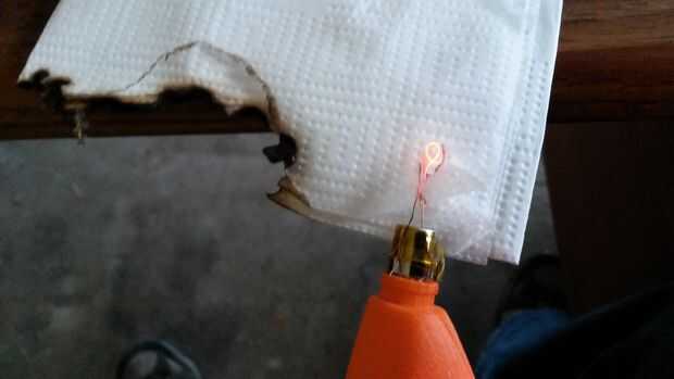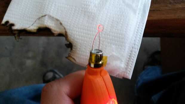 Encender el Solderdoodle y el alambre de Kanthal deberá brillar rojo con el fuego a partir de calor! He encontrado dejar que el fresco de alambre de Kanthal antes de cada prueba produjo los mejores resultados de ignición. También, empujé el alambre de Kanthal a la toalla de papel antes de encender la Solderdoodle.
