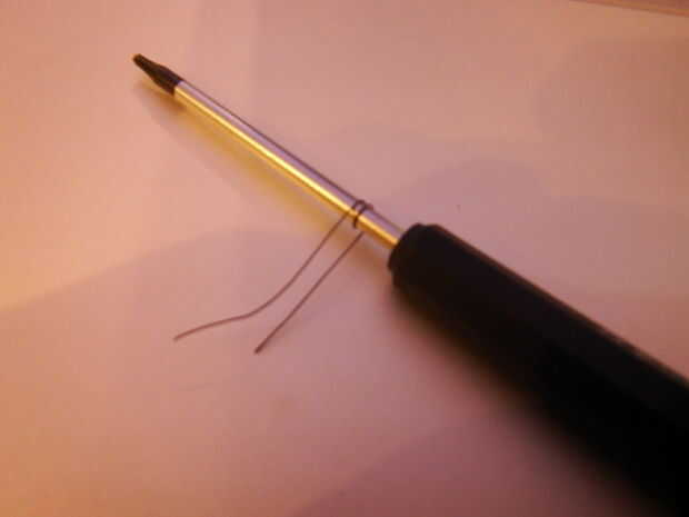 Primero, retiro la punta de la Solderdoodle. Luego, envolver un par de vueltas del alambre Kanthal alrededor de un eje del destornillador luego conecte un extremo del alambre en el interior de la toma de Solderdoodle y el otro extremo hacia el exterior. Una buena manera de conectar el alambre de Kanthal es doblar un extremo para pegar dentro del receptáculo y cinta adhesiva el otro extremo hacia el exterior con cinta de Kapton.