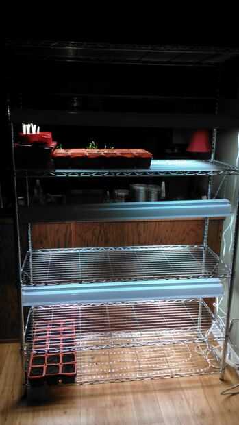 Lo que hice fue sólo poner luces en mis estanterías top 3 (no la parte superior, pero unido a la parte inferior del estante superior). Utilizar la parte superior de mi estante para algunos elementos de almacenamiento (para macetas mezcla, bandejas, etc.). Yo no he puesto una luz en la bandeja de salida (inferior donde la luz de la cuerda está fijada) porque a partir de las semillas no necesitan luz hasta el emerger de la mezcla de rellenado. Una vez que salen, me los muevo hasta la siguiente plataforma.