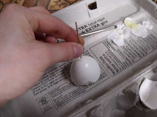 En orden para sus plantas de prosperar la cáscara debe ser capaz de drenar el exceso de agua. Para este paso necesita una aguja de coser y una herramienta de tipo mazo blando. Usé la punta de la goma de un destornillador. En la parte inferior de cada depósito martillo suavemente la aguja en la cáscara. Crear un agujero lo suficientemente grande como que el agua drene hacia fuera.