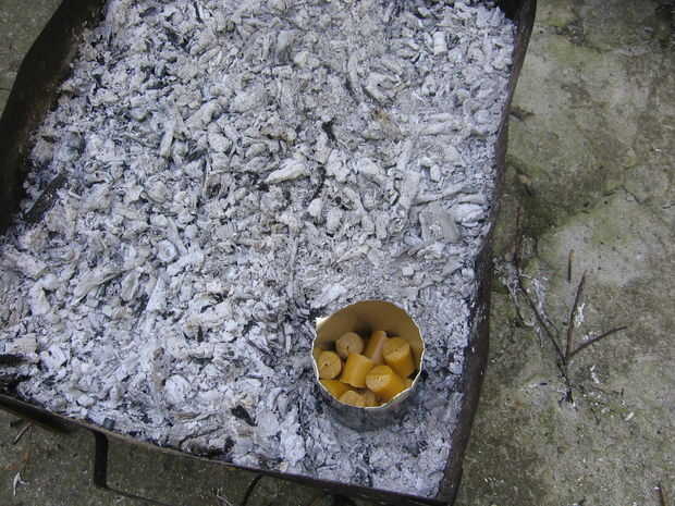 Para el primer tipo de arrancadores de fuego necesita una vela o un trozo de cera y algunos serrín. Cortar la vela, poner en una lata y colocarlo en el fuego para derretir la cera. Cuando la cera se haya derretido añadir serrín. Poner aserrín tanto como sea posible para poder hacer piezas como en la primera foto. Use la mecha de una vela que encenderán el iniciador de fuego fácilmente. 'Bake' lo que hizo alrededor de la mecha y ya está listo para usar su iniciador de fuego.
