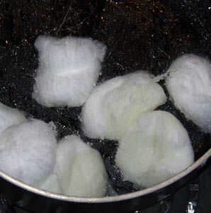 Mojar un algodón en la cera derretida y deje el algodón empape la cera para arriba bien, entonces ponga a un lado para secar. Lo que me gusta sobre este método aparte de los materiales son baratos, es que cuando el algodón se está secando, puede aplastar en formas y dejarlos hasta la seca de cera para que ocupan ningún espacio en absoluto.