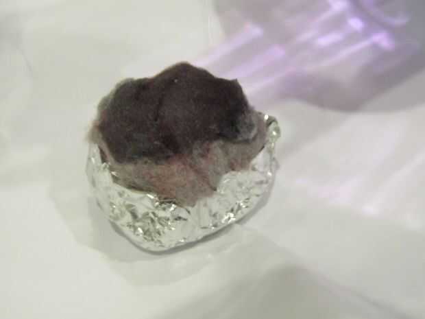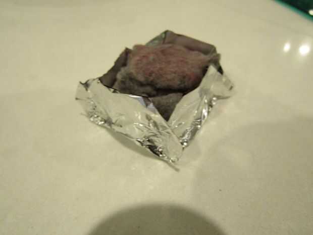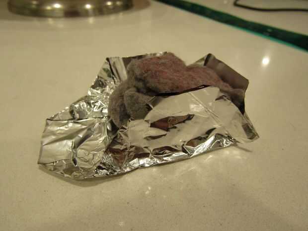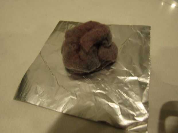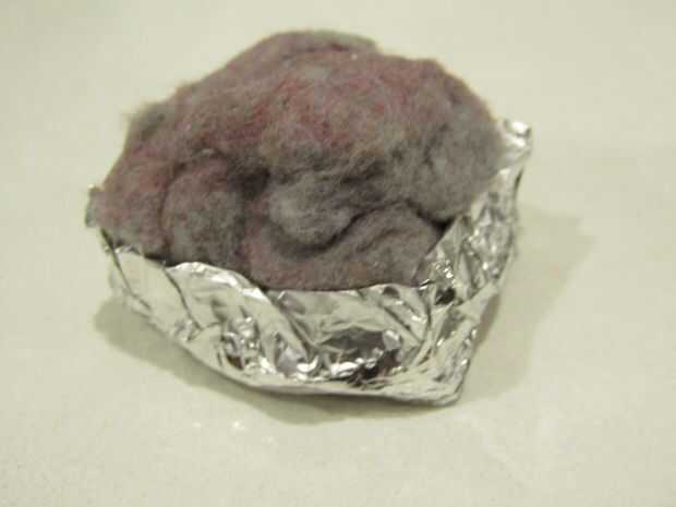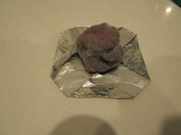 Cortar un cuadrado de 10 x 10 de papel de estaño. Coloque su bola de pelusa en el medio. Luego doblar en cada esquina para que toque la bola. Ahora doblan cada lado. Asegúrese de que la bola es accesorio muy perfectamente. No demasiado apretado y no muy suelta. Una vez que su bola parece Diagrama 4, con todos los lados doblados para arriba. Doble cada lado ahora aproximadamente la mitad de la bola de pelusa está mostrando. Ahora sumerja la pelusa en alcohol metílico. Asegúrese de limpiar cualquier desnaturalizado que se encuentra en la parte exterior de la hoja de lata.