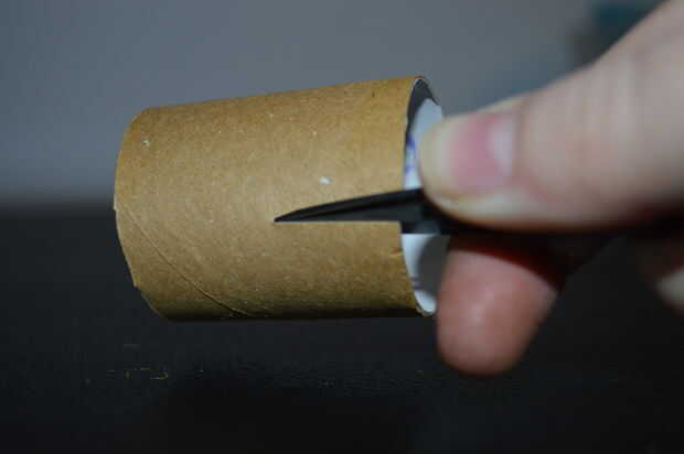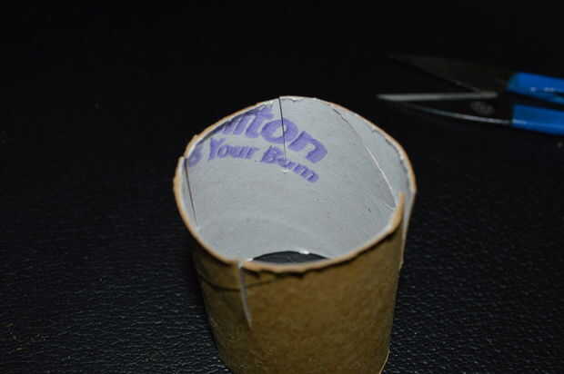 -cortar 4 líneas uniformemente espaciadas aproximadamente 1 1/2 cm de largo en un extremo, entonces esto se dobla para hacer la base de la maceta.