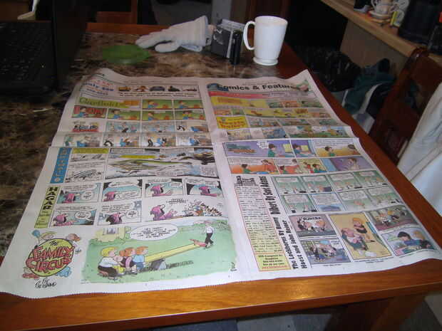 Recoger una hoja de periódico y pone por encima de la mesa antes.  Cortar o rasgar por la mitad, como se muestra en la foto segunda y una de las piezas retiradas.  (Tenga cuidado si usted rasgarla--desea un borde limpio!)