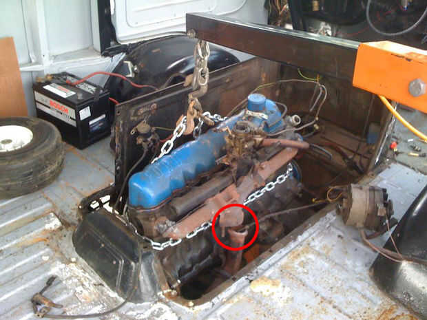 Segunda imagen es la 144ci que más tarde nos cayó en la furgoneta. En este nos une la cadena a 2 puntos del bloque motor mediante pernos de acero templado #8. No use nada menos que esto ya se romperá y su motor de 500-700lb se caen al suelo aplastamiento en su camino. Si tienes suerte se romperán antes de levantarla y probar este punto. Ir a auto parts tienda y solicitar pernos endurecidos y traer un ejemplo del tamaño y el hilo que necesita. Probar ninguno de los pernos que se pueden encontrar en los puntos donde desea colocar la cadena y asegúrese de que usted puede conseguir profundidad y una buena cantidad de hilos de rosca en una parte sólida del bloque del motor.