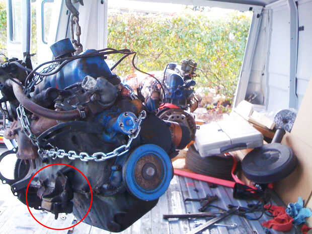 Suba otra vez el alzamiento y el motor atornillado hacia adelante y hacia atrás suavemente hasta que se rompe de los soportes del motor y transmisión. Bombéelo para arriba empujando hacia delante el motor para eliminar la transmisión bellhousing.