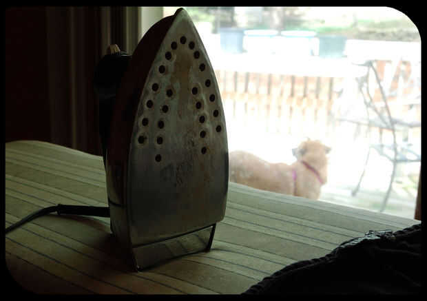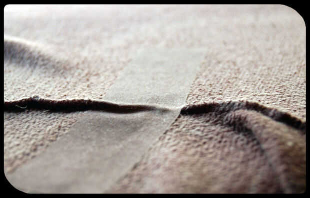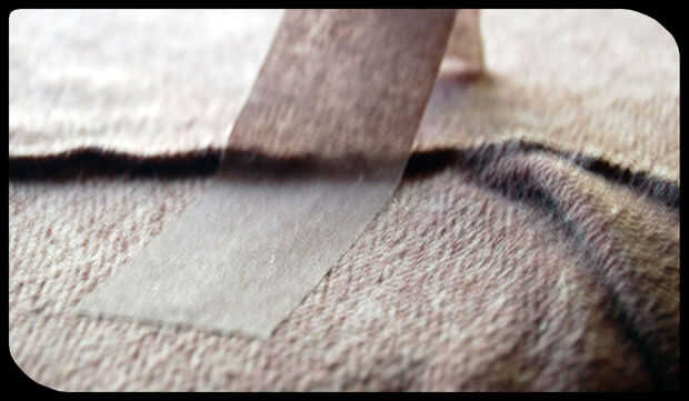 Con sus sudores el revés y los bordes de la rasgadura presionados juntos, plancha la cinta, el lado brillante hacia abajo, durante la primera mitad de la rip. Ajustar el rip en el otro lado y luego del hierro allí.