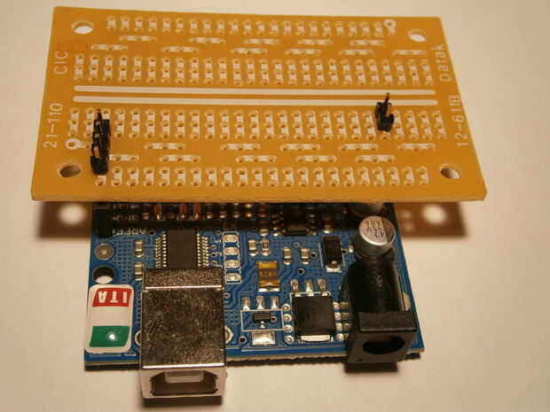Inserte la tira de dos pines los pines 5 voltios y tierra contiguos en el arduino.