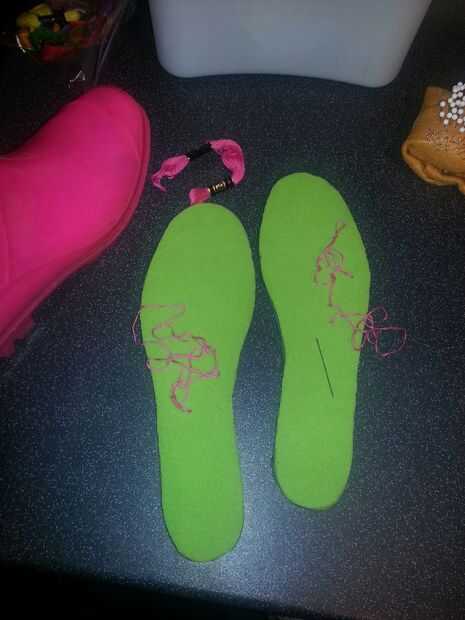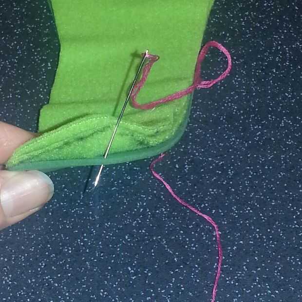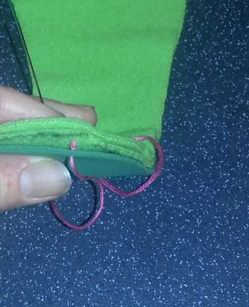 Comenzar a coser empujando la aguja a través de la parte inferior de la capa de espuma. Esto atrapa el nudo dentro y sentirse más cómodo. Y se ve bastante. Incluso si tú y tus pies son los únicos que mirarlo.