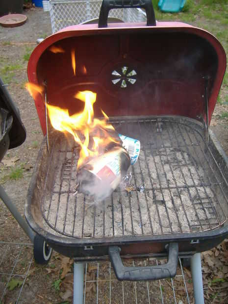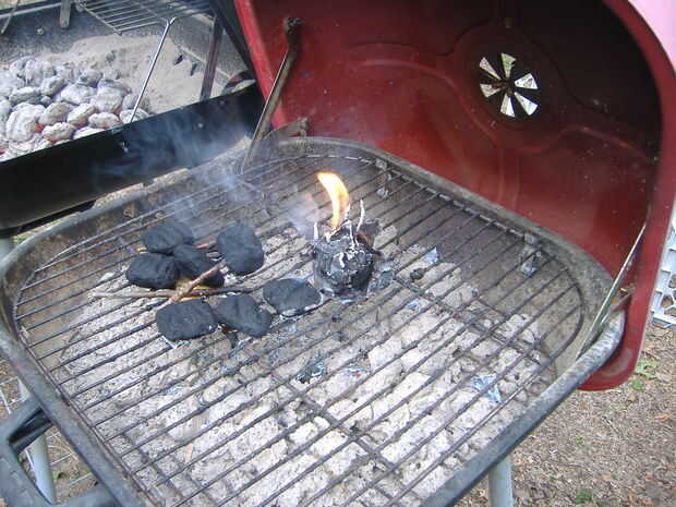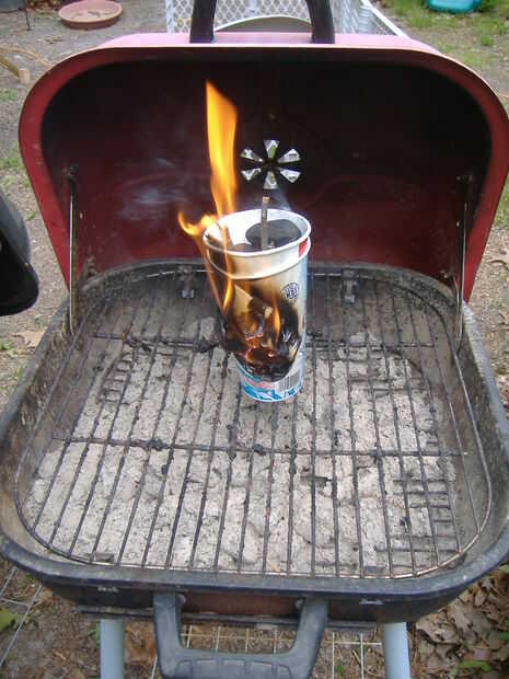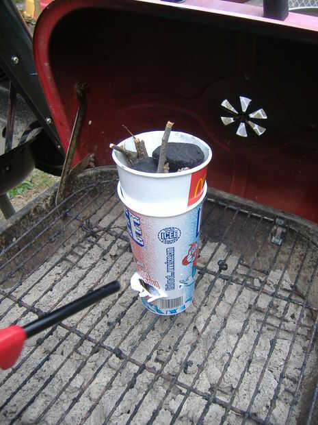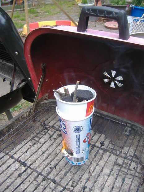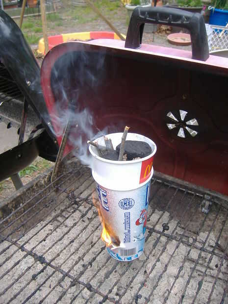 Luego, enciende la pelusa a través de uno de los agujeros en la Copa más grande. El fuego irá de la pelusa de las hojas y luego pega el carbón de leña.