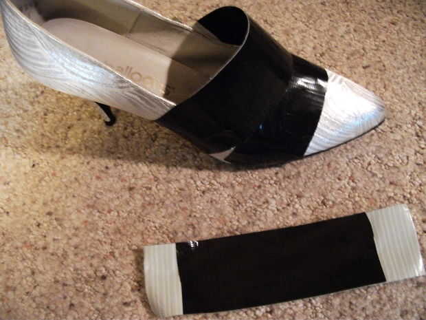 Ya que este zapato tiene un pie abierto la cubrí hacerlo más arranque como. Esto se hace con dos tiras de cinta de conducto puesto encima de cada una colocan sobre calzado. Recuerde que usted tendrá que tomar su pie hacia adentro y hacia afuera para no hacer demasiado apretado.