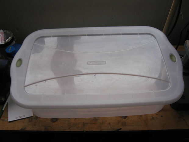 Lo único que usted necesita para hacer esto es un recipiente de plástico con tapa. Asegúrese de que esté lo suficientemente grande como para acomodar sus botas. Me aseguré de que las botas cabrían dentro de la depresión en el centro. Esto evitará que la fusión de la nieve que fluye sobre el borde de la tapa.