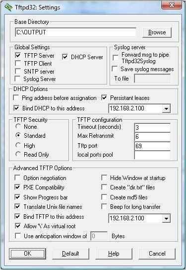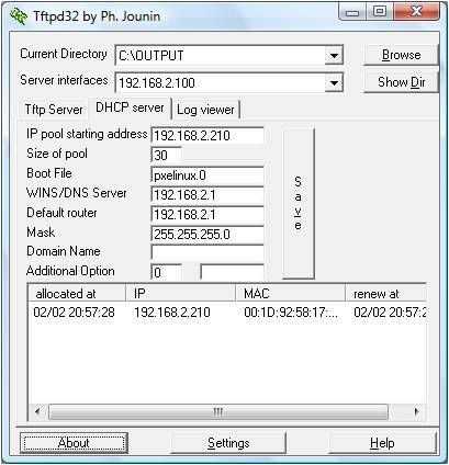 Suponiendo que ha instalado TFTPD32, las imágenes que se muestra a continuación son la configuración de un servidor típico tales como:
