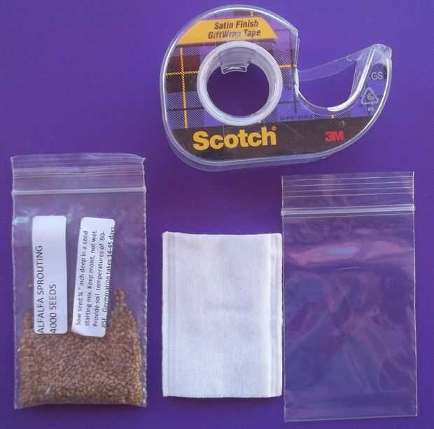 Primero necesitarás semillas, (yo usé brotes de alfalfa) Un parche de algodón Una bolsa de plástico mini y por último pero no menos importante poco de cinta scotch.