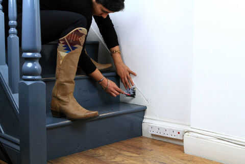 Determinar la mejor ubicación para sus sensores y una posición discreta para fijar la placa de toque. Puede ubicar en una pared o directamente en el paso de la parte inferior como en la imagen. Es útil tener un enchufe cerca por.