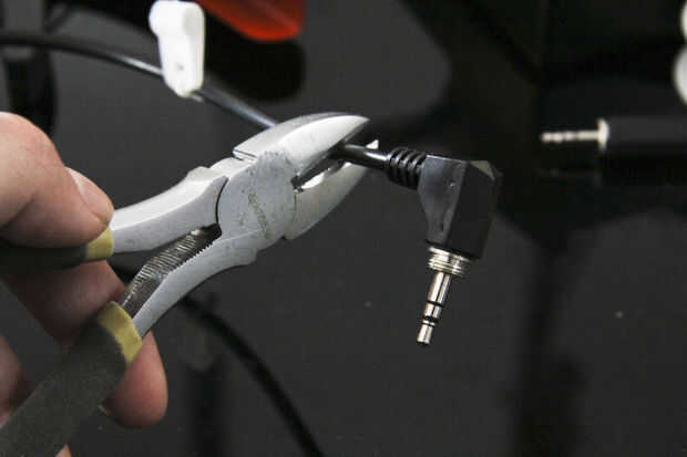 Yep. No hay vuelta atrás ahora, sólo ve por ella. Luego use un alicate para quitar la carcasa de alambre alrededor de la médula. Mis auriculares habían cubierto los cables dentro de la caja del cable principal, si los auriculares son como que demasiado, tienes que tira hacia abajo suficiente aislamiento para alambre de soldar el conector nuevo en su lugar.