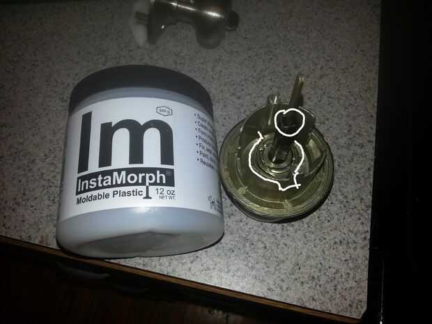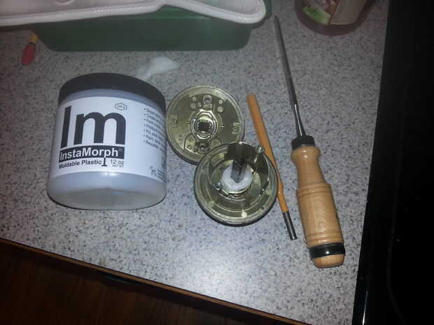 implicado dos pequeños agujeros dentro de la cerradura de la perforación, golpeando ligeramente los entonces añadir dos tornillos. Fui rumbo a la tienda obtener las herramientas adecuadas cuando vi mi envase de Insta-Morph (genéricamente conocido como Polycapralactone, pero ya que es una palabra larga para escribir, y el envase dice Insta Morph, vamos con eso). Todos tenemos que hacer es fijar el tubo cuadrado a la lavadora se muestra en la imagen. Un poco de Insta-Morph hará el truco muy bien. Esto tiene la ventaja de ser no destructiva a la cerradura. Si usted está alquilando, simplemente quitando esta pieza de IM volverá el bloqueo a su función original. Hay mucho menos posibilidades de destruir el bloqueo de esta manera también.