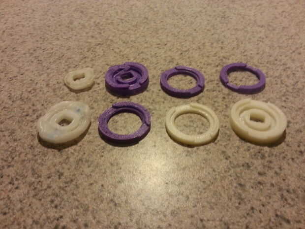 También estoy trabajando con un local sin fines de lucro madre juventud liderazgo organización llamada despertador robótica para desarrollar una versión impresa 3D. Espero tener disponible pronto. Si lo podemos conseguir impresión fiable, vamos a ponerles para arriba en forma maneras o thingiverse con todas las ganancias van a despertar robótica. Las imágenes en este paso muestran los primeros intentos de crear una pieza de trabajo. Medidas hacia abajo dentro de la perilla de la puerta es difícil y añadir a las tolerancias de impresoras 3D nivel actual de hobby y el hecho de que nunca he usado uno, mientras que trabajar con los estudiantes de edad secundaria (que han utilizado las impresoras antes). Estamos trabajando en conseguir cada una de las capas de ajuste donde se supone que. Kyle y Ben, los dos jóvenes estoy trabajando con, están muy bien informados con respecto a la impresión 3D y han sido una gran ayudan introducción me, gracias a tanto de ellos y despertar robótica.