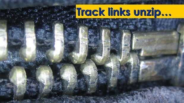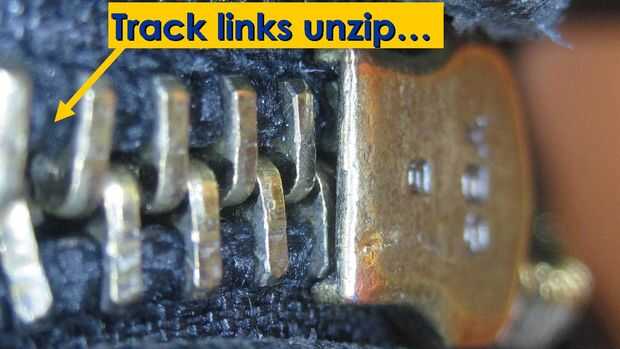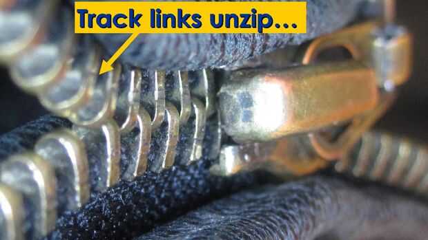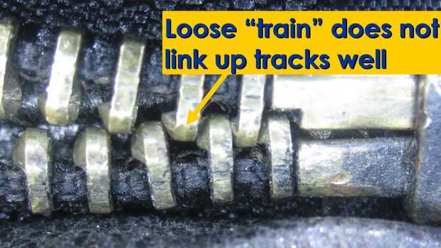 Como se puede ver en estas fotos, aquí es lo que sucede cuando la cremallera tren correctamente no orientar y vincular entre las pistas. Los dedos que componen los enlaces de cada pista tienen un hoyuelo pequeño en un lado y una protuberancia en el otro. Normalmente los golpes de un dedo en el hoyuelo del dedo siguiente, alternando de un lado de la cremallera pista al otro. Como vincularse, topetón para puntos alternados los dedos, cierra la cremallera y esto hace que sea difícil separar horizontalmente (los dedos deslizarse muy de cerca y embalar firmemente).