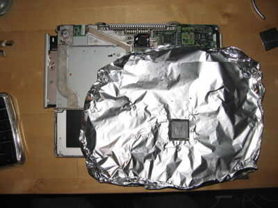 Aplique 4 hojas de papel de estaño en el chip de cortan un agujero para el chip. Coloque una pequeña soldadura en la parte superior del chip.