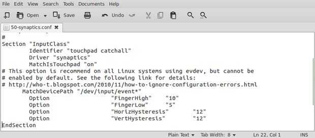 sudo gedit /usr/share/X11/xorg.conf.d/50-synaptics.conf
